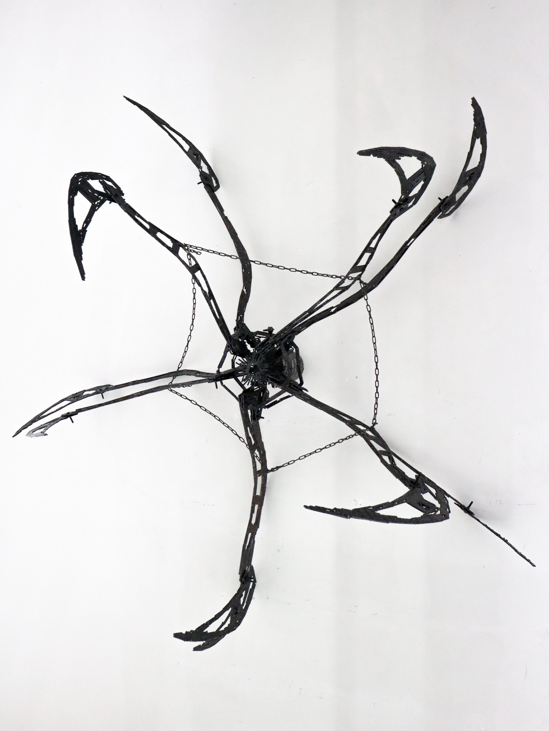 Matter does not appear as a mere support or medium, but as a territory of conflict and transition. Each gesture carries, simultaneously, a promise of construction and a possibility of loss, and within this delicate balance lies the power of the creative process. The chosen materials — steel, chains and glass — embody within themselves this tension between resistance and fragility. The weight and strength of the metal confront the transparency and vulnerability of the glass, composing a field of forces that never stabilises. The chains, at once a bond and a boundary, extend this play between restriction and openness. Each piece is thus born from the friction between materials of distinct natures, which attract and repel one another, and whose dialogue gives shape to a space where creation and destruction intertwine without ever cancelling each other out.