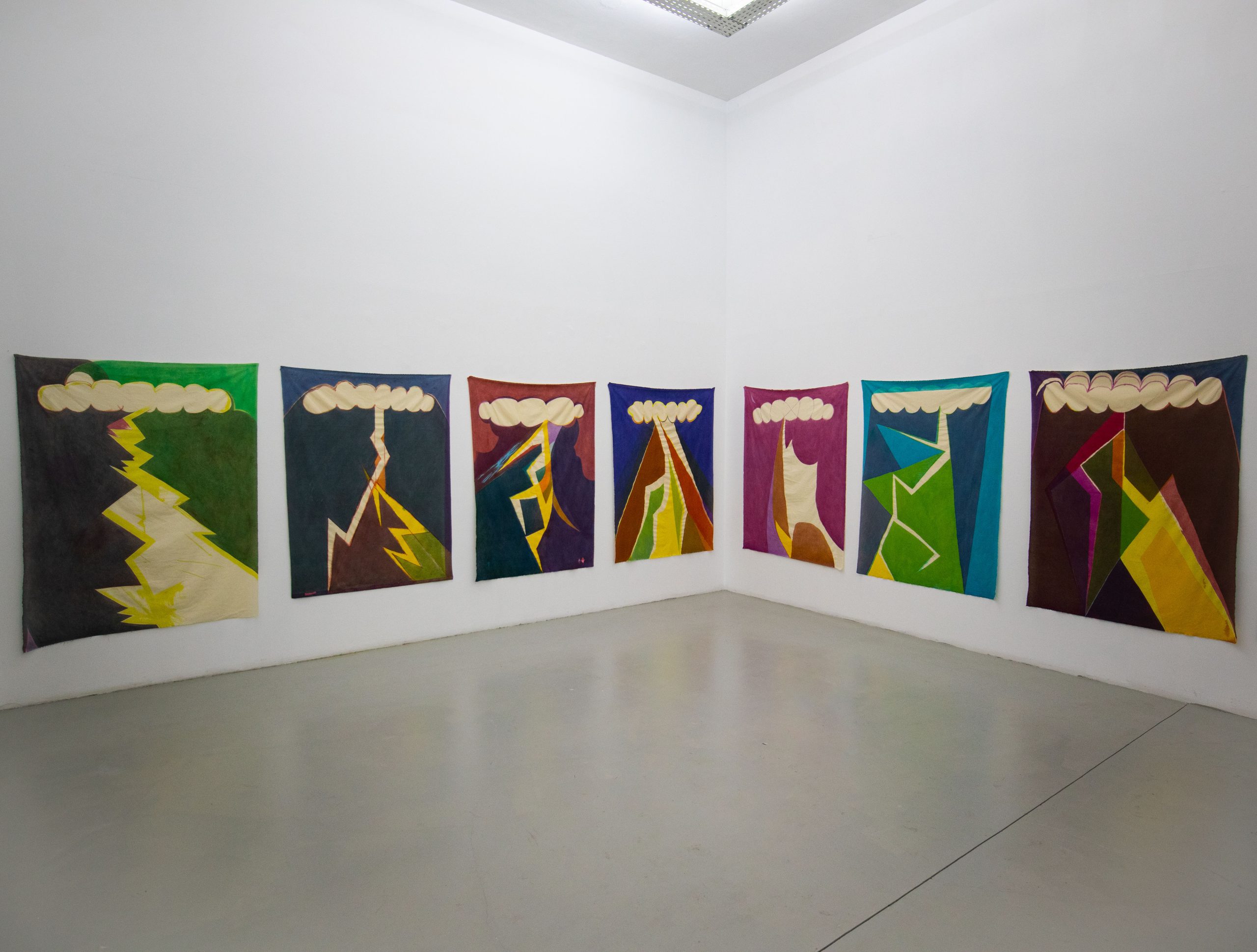 Por outro lado, os recortes de caráter futurista e os desenhos iconográficos, que remetem para o grafismo da banda desenhada, relacionam-se com as pinturas de André Sousa, onde a energia é representada por um, ou vários, raios. Uma nuvem, branca e serena, dá origem a algo indomável, definido por cores fortes e contrastantes: o raio, que “tanto impressiona pela beleza, como mata.”³ É emoldurado por limites que o tentam conter, mas não são bem-sucedidos. Como que uma tentativa de controlar algo que seria impossível – um fenómeno atmosférico e energético esmagador captado e enjaulado num suporte bidimensional. O artista desafia o olhar e a imaginação do espectador, convidando-o a completar o desenho. Ao olhar as imagens, ouvimos um trovão, que nos atravessa sinestesicamente o pensamento.