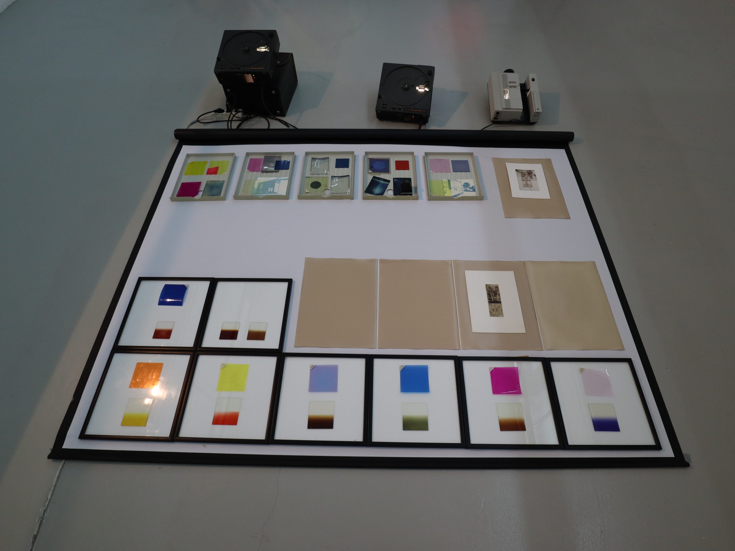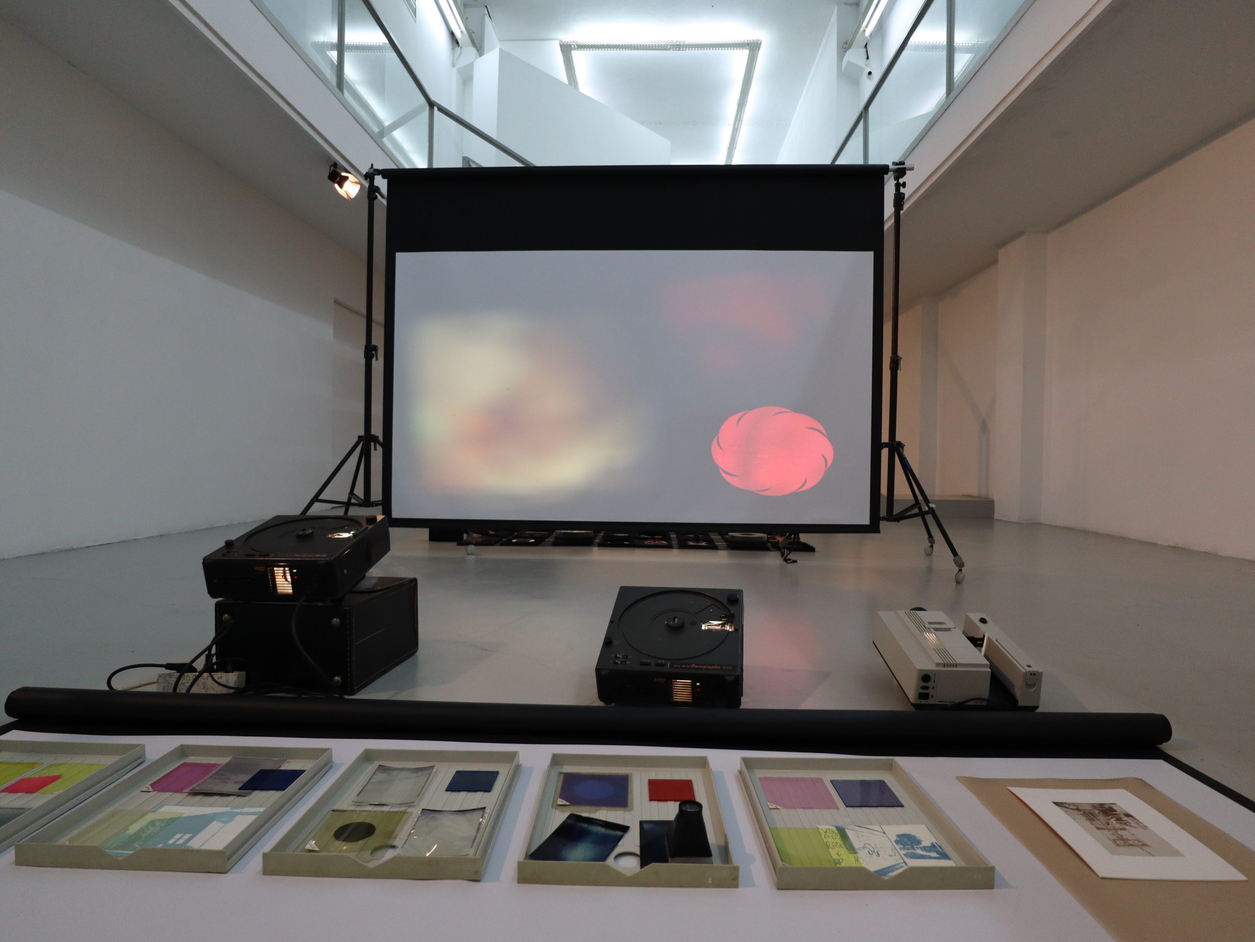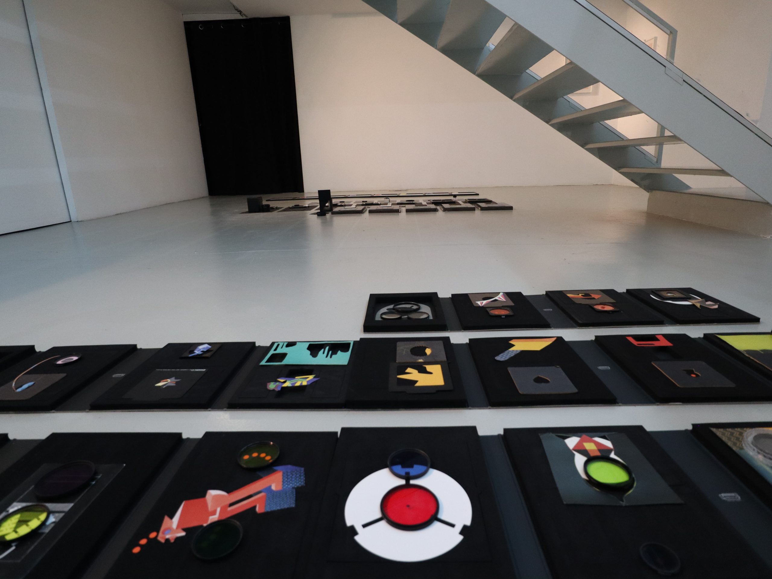 Na obra de Sérgio Leitão, a figura dilui-se em manchas de cor, mais ou menos iluminadas, dando lugar a paisagens abstratas. É pela assemblage de objetos, do arquivo pessoal do artista e relacionados com o local onde os expõe, que nos apercebemos d’ “a espantosa realidade das coisas”². Ora sobrepostas, ora lado a lado, as imagens não infligem hierarquias, coexistem em harmonia, porque em conjunto contam histórias. Existe uma permanência das imagens, ainda que estas sejam passíveis de ser alteradas – encontram-se em potência, pois estão abertas a inúmeras possibilidades. Cada montagem de coisas é realizada in situ, como não poderia deixar de ser, uma vez que a obra dialoga diretamente com o espaço onde se insere. Porém, é precisamente esse trabalho processual, comummente realizado em atelier, que nos é apresentado a cru como parte integrante da obra.